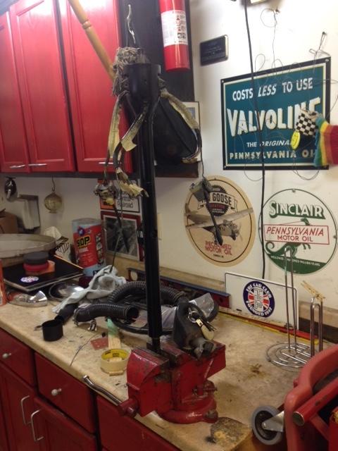 Steering column.removed, ignition switch removed, it will be relocated to dash, and new headlamp dipper and turn signal are on order. Painted satin black.